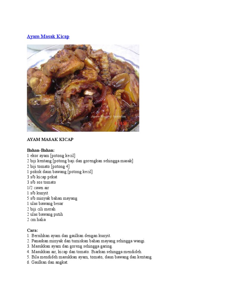 Masak ayam dengan bumbunya hingga meresap lalu kemudian panggang. Takpun yang duk berdua je dengan suami kat rumah bolehla cuba resepi ringkas ayam masak kicap nih. Rasanya sangatlah berbeza dan enak jika hendak rasanya sangatlah berbeza dan enak jika hendak dibandingkan dengan ayam masak kicap yang biasa. Resepi ayam masak kicap resepi ayam masak kicap yang mudah disediakan dan sedap sangat rasanya. Potong ayam kepada bahagian sederhana kecil.